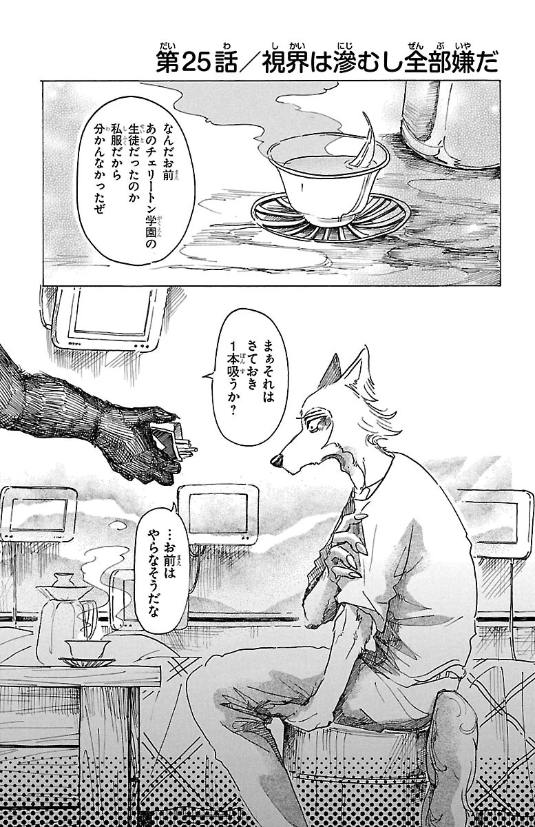 Mientras que Legoshi intenta absorber toda la información que acaba de recibir, Gouhin le sirve té y le habla sobre la revisión, Legoshi recordando algunos rasgos de los pandas que aprendió en la escuela, le pregunta a Gouhin como se ve así mismo como psicoterapeuta, ¿cómo un panda con cuerpo fuerte? o ¿cómo un panda que nunca a comido carne?, Gouhin indica que es pregunta inteligente, menciona que aunque los pandas solo comen bambú la pregunta no tiene sentido ya que el ya ha abandona a la bestia dentro de él, Gouhin cuenta que se convirtió en medico hace tiempo por un sentido del deber, lucho con varios pacientes que casi lo mataban en algunas ocasiones y resume diciendo que solo es un medico de cuerpo fuerte, Legoshi le cree y pregunta por el tratamiento y Gouhin dice que lo están haciendo, Legoshi reclama no ser un paciente, diciendo que intenta hacer algo al respecto y se ha vuelto amigo de Hal, el Gouhin lo calla agresivamente diciendo que sus sentimientos por Hal son en realidad son instintos depredadores disfrazados y que rompa sus lazos con ella lo mas pronto posible, Legoshi menciona que como nunca ha sentido sentimientos románticos por lo que no sabe explicarlos, Gouhin se queda pensando, Legoshi pide irse pero antes de hacerlo Gouhin le da varios DVDs y revistas eróticas de conejos diciéndole que es parte del tratamiento, si al verlos Legoshi se excita podría sentir una atracción hacia animales pequeños y si no, esta en peligro, Legoshi incrédulo y harto decide no hacerle caso, mientras sale del mercado Legoshi solo recuerda sus recientes experiencias y al salir del mercado, se encuentra con Aoba quien lo estuvo esperando, revelando que no se atrevió a comerse el dedo aquel anciano, lo que conmueve a Legoshi y llora deseándose valerse por si mismo.